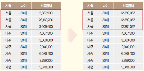 ex) [김철수, 3만 원], [이영희, 2만원], [박민호, 5만원] =(평균값)> [김철수, 3만원], [이영희, 3만원], [박민호, 3만원]